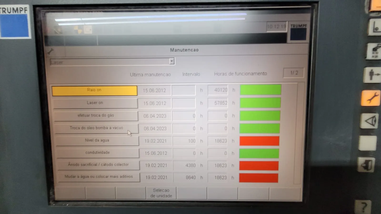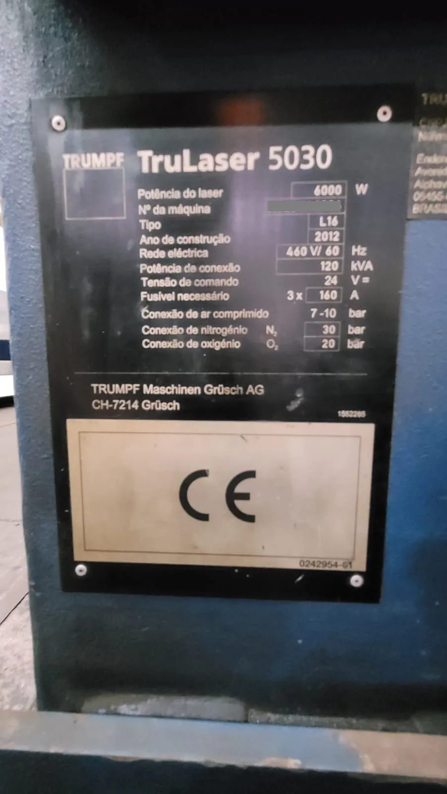 Com um ano de fabricação de 2012, modelo TruLaser 5030, potência de 6000 Watts, comando Siemens Sinumerik 840D.